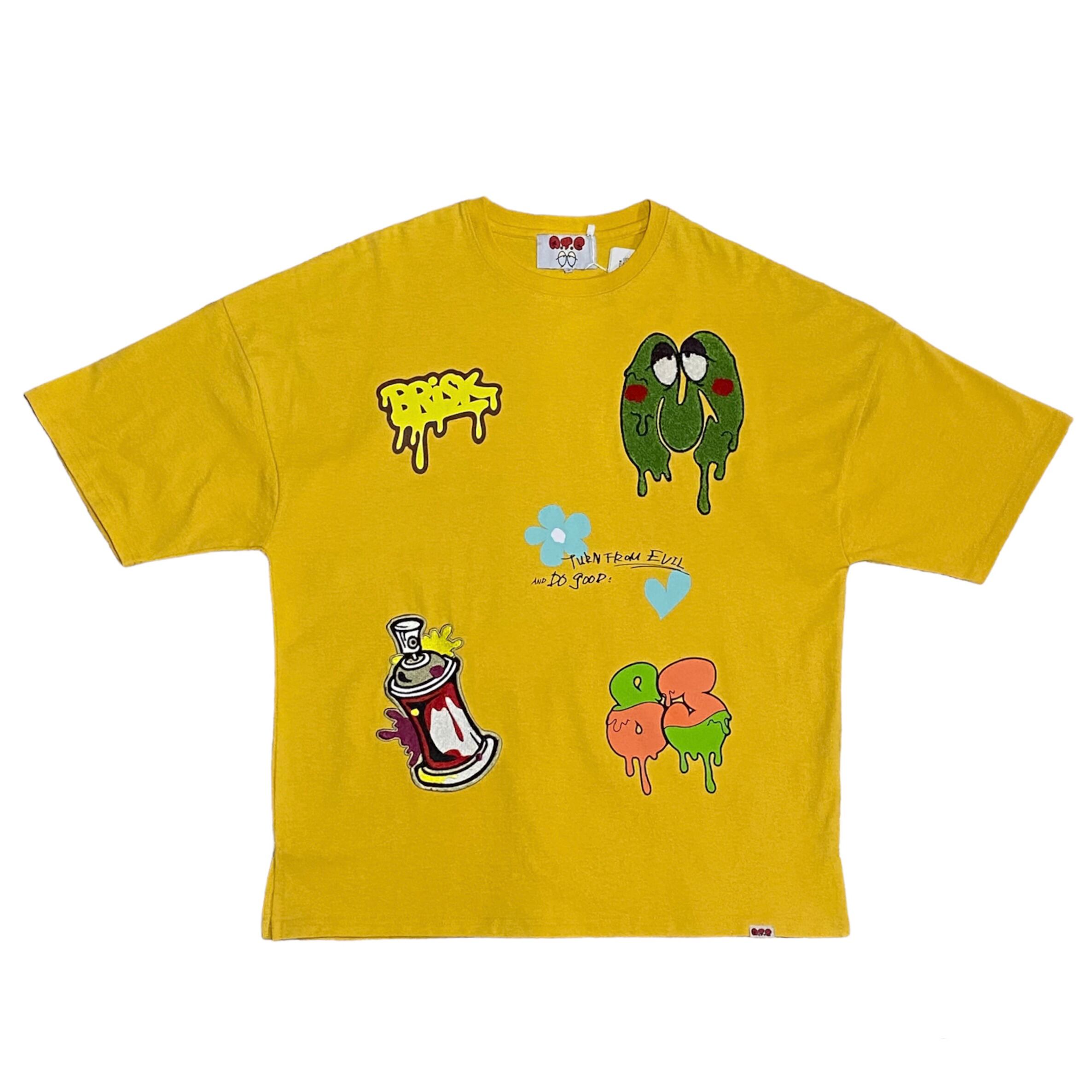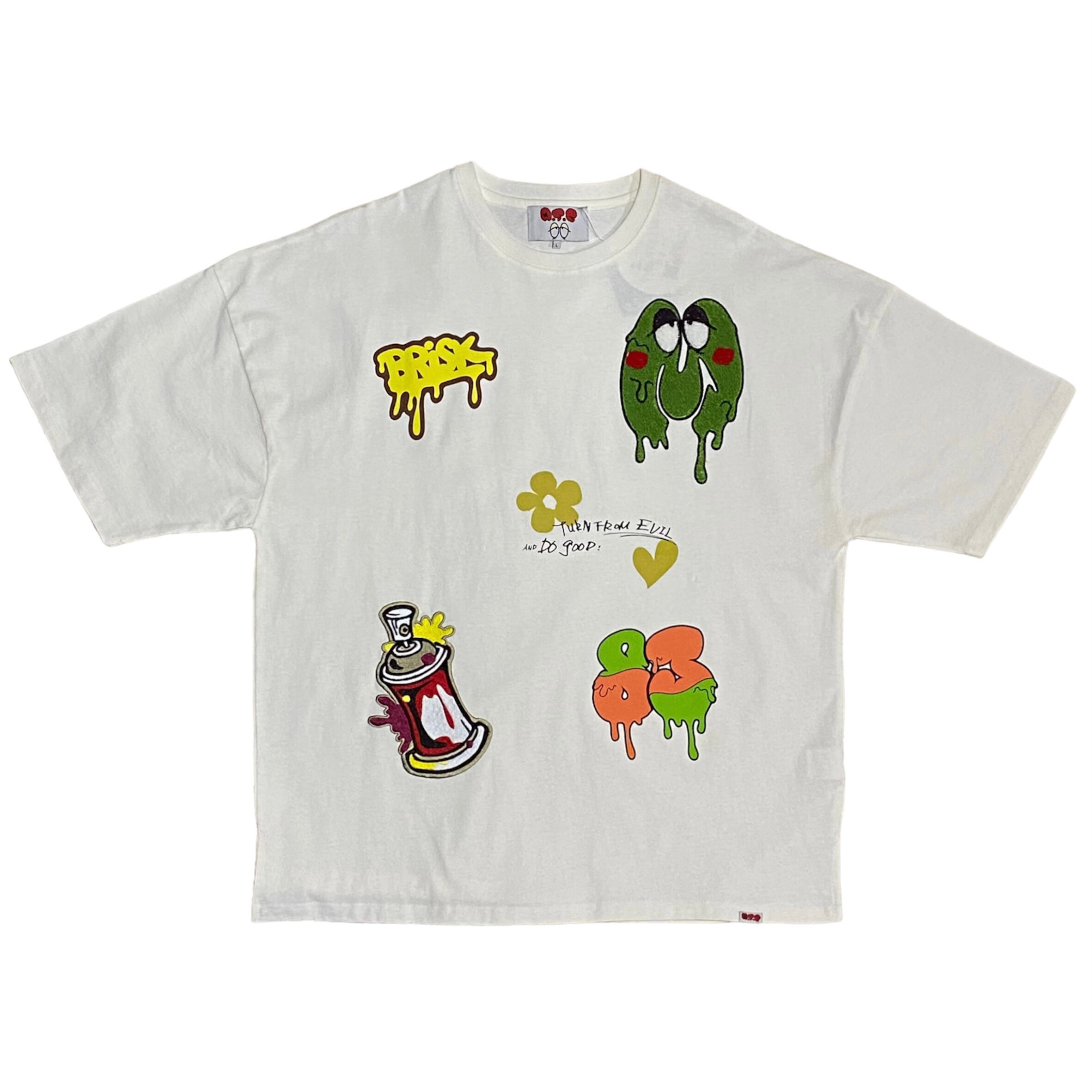 自由奔放なアート感覚のグラフィティプリントが目を引くTシャツ。左胸にはサガラワッペン、右下にはスプレーワッペンがプリントされています。